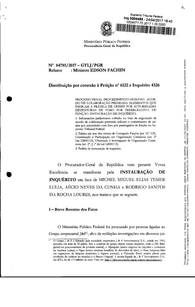 "A despeito da fase preliminar de negociação do acordo de colaboração premiada, sustenta o Ministério Público Federal que a peculiaridade do caso em tela exige imediata instauração de investigação, pois ao contrário do que usualmente ocorre quando se está em fase preliminar de negociação, os fatos até o momento narrados dão conta de práticas supostamente criminosas cuja execução e exaurimento estão em curso ou prestes a ocorrer, o que torna obrigatória a pronta intervenção do Estado dirigida a cessar as condutas e investigá-las de forma eficaz", escreveu Fachin.